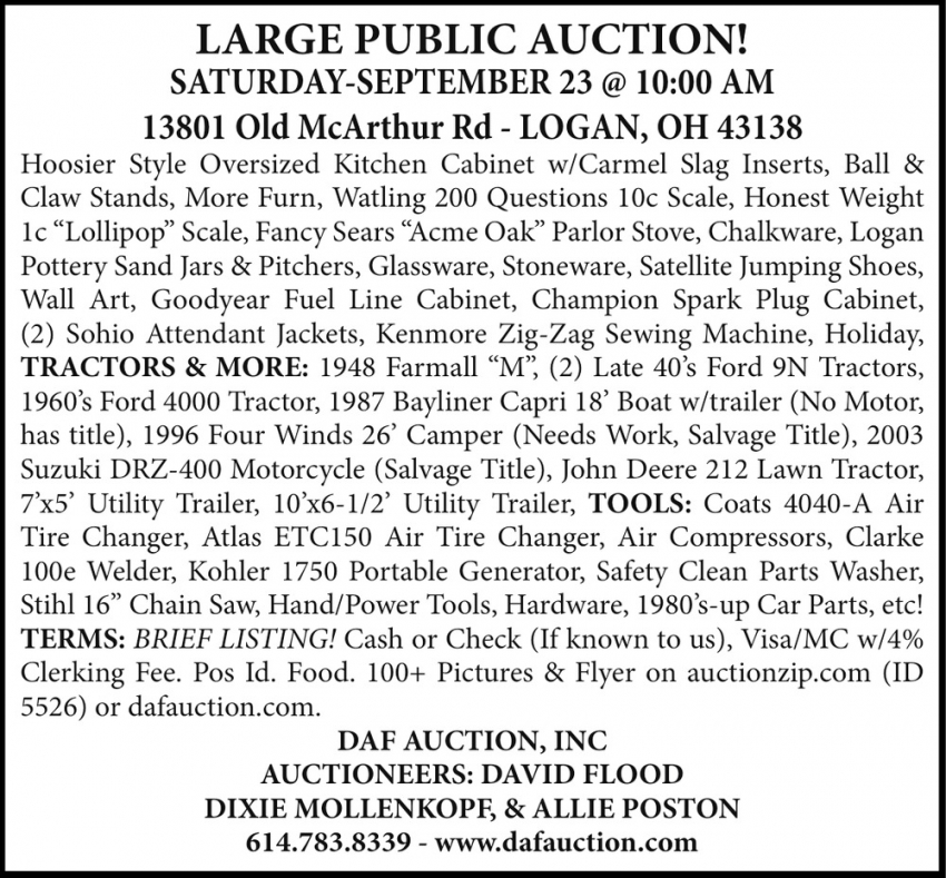 Sep 23, 2023. Daf Auction, Inc Auctions Ads from The Logan Daily News