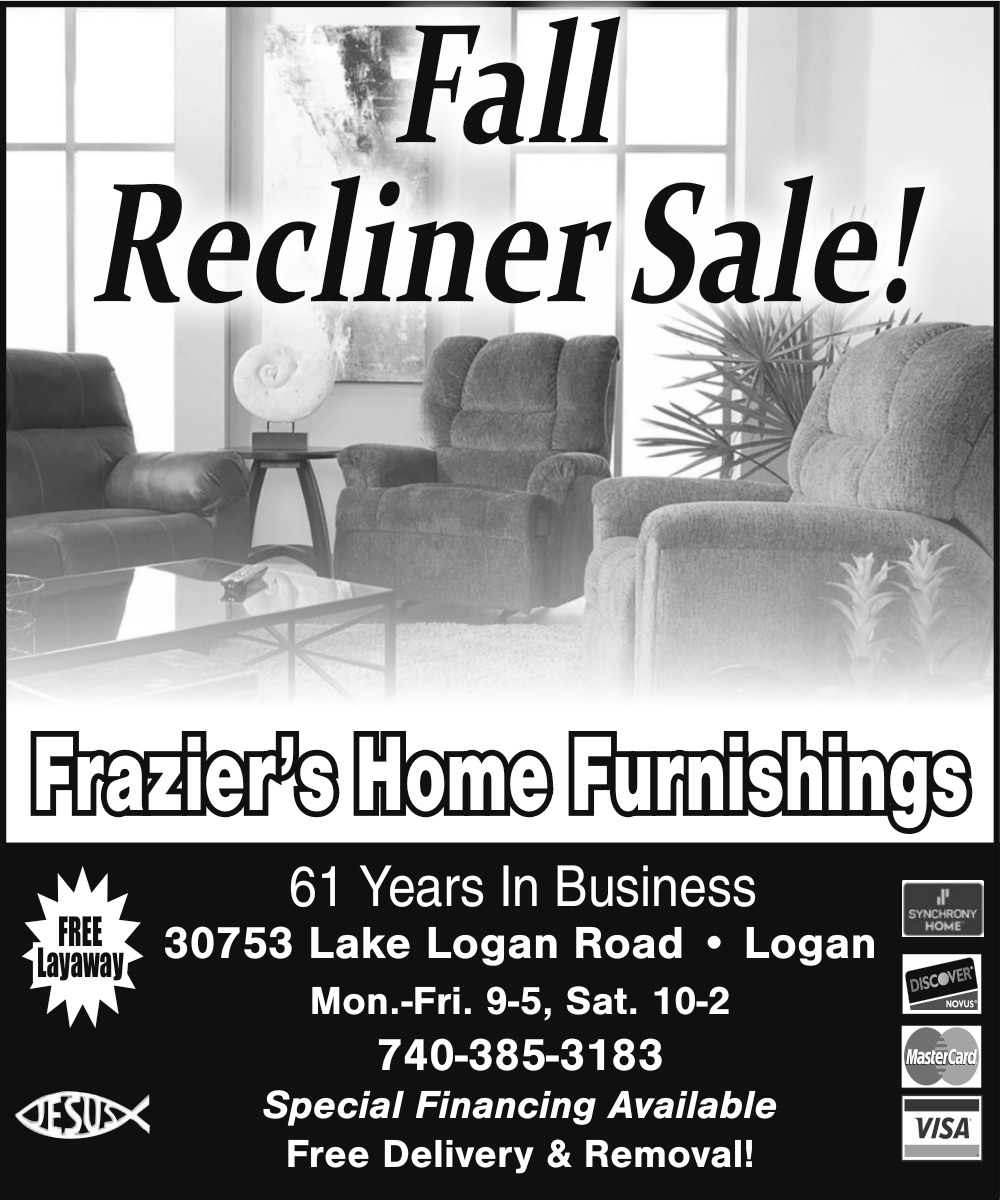Oct 28, 2025. Frazier's Home Furnishings Home Furnishing Ads from The Logan Daily News