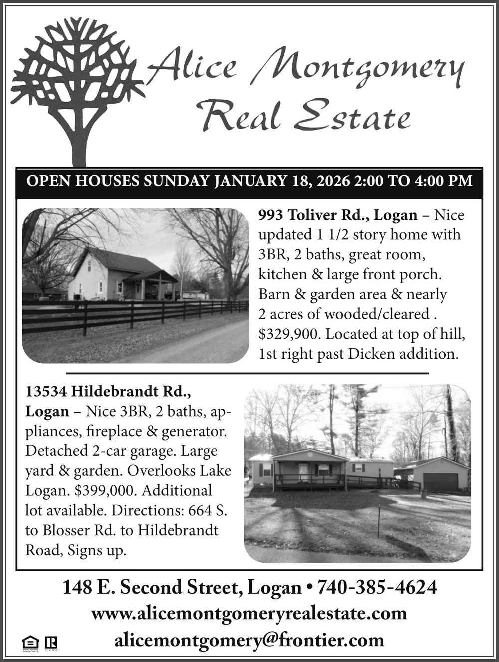 Jan 17, 2026. Alice Montgomery Real Estate Inc. Real Estate Ads from The Logan Daily News
